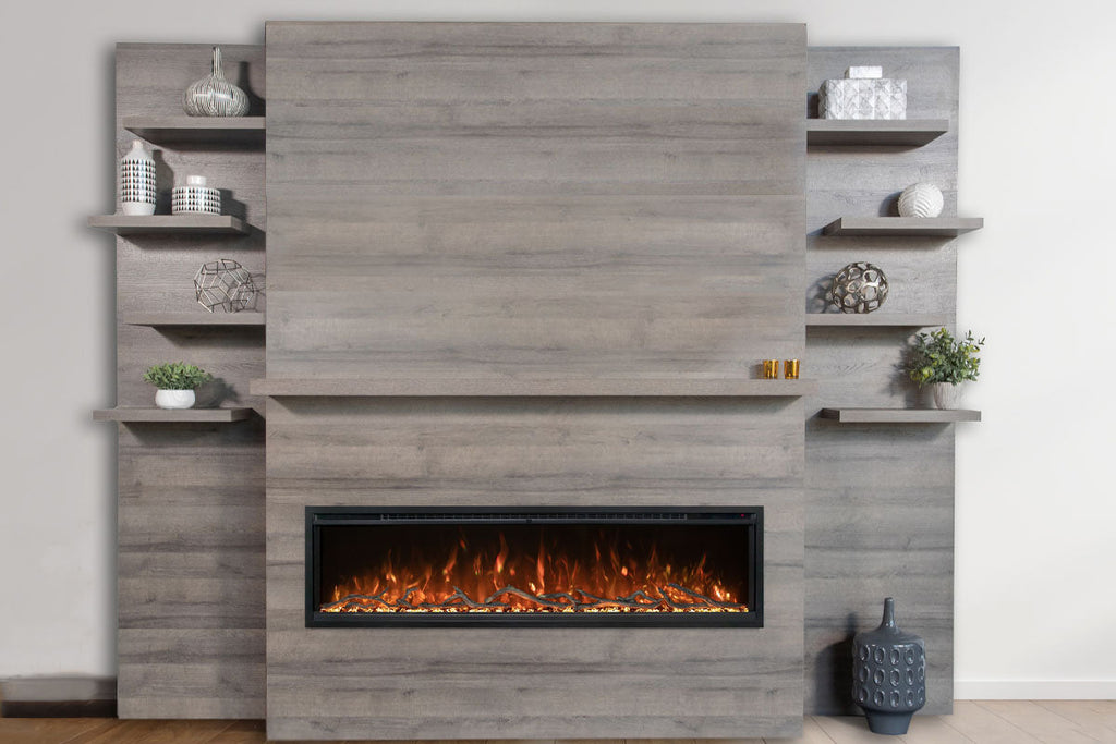 Upgrade your home, rental, or condo with the functional and stylish Modern Flames Allwood Media Wall with Spectrum Slimline 60" Electric Fireplace. The Allwood Wall Fireplace System has a solid plywood frame with Commercial Grade Laminate finish. The Allwood Wall Fireplace System is designed to be easily installed on any permanent wall with support and electricity for the fireplace. No need to tear down walls or build a new frame from scratch. The sleek contemporary Modern Flames Allwood System features two main wall sections, two side shelf wall sections, eight slide-in side shelves, one Allwood mantel, four wood box framing pieces and four wood wall claws. The complete unit covers 10 ft wide by 8 ft high area.