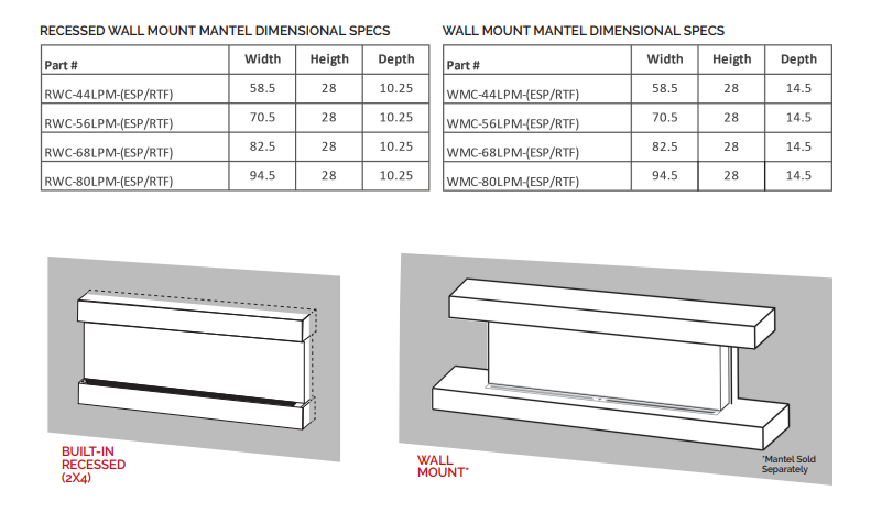 • For 68" Fireplace: 28" H x 82.5" W x 10.25" D