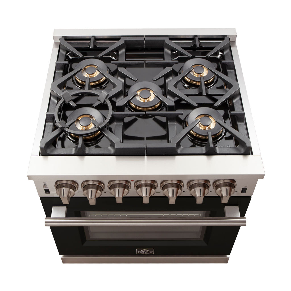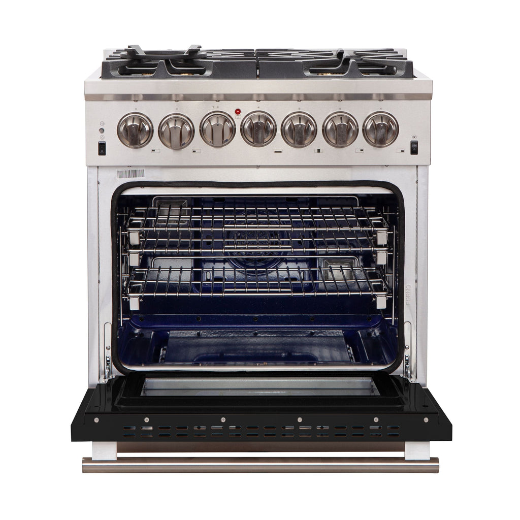 Forno 30" Capriasca Gas Range with 5 Burners and Convection Oven in Stainless Steel with Black Door (FFSGS6260-30BLK)