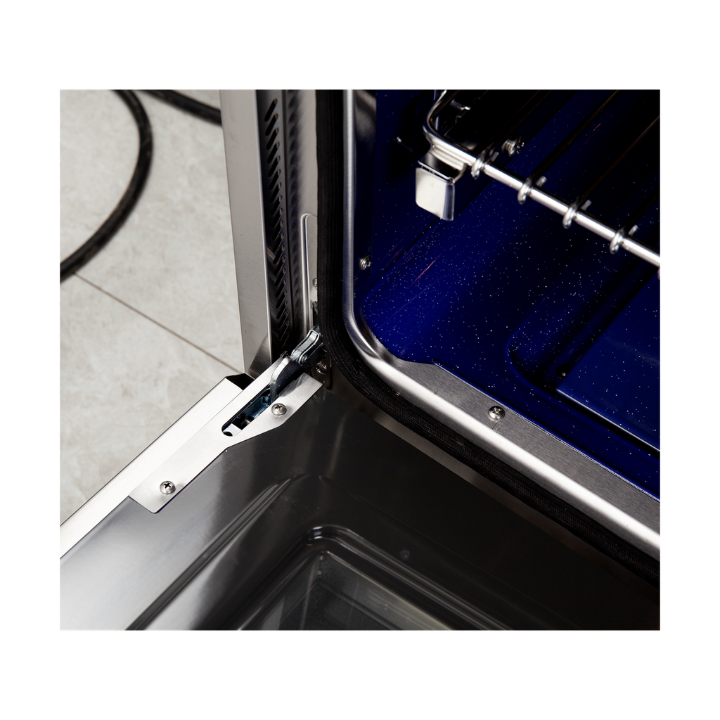 • Blue Enamel Oven Interior • 3-Layer Oven Door Glass
