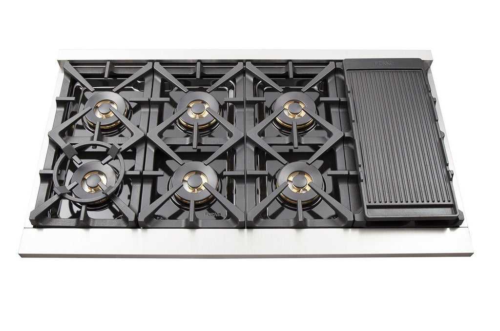 This 48" Pro-Style Gas Range by Forno offers an 8 Defendi Italian Brass Burner cooktop and 6.58 cu. ft. of total oven capacity. The range also features cast-iron grates, convection fan, and halogen lighting. Available at Home Outlet Direct.