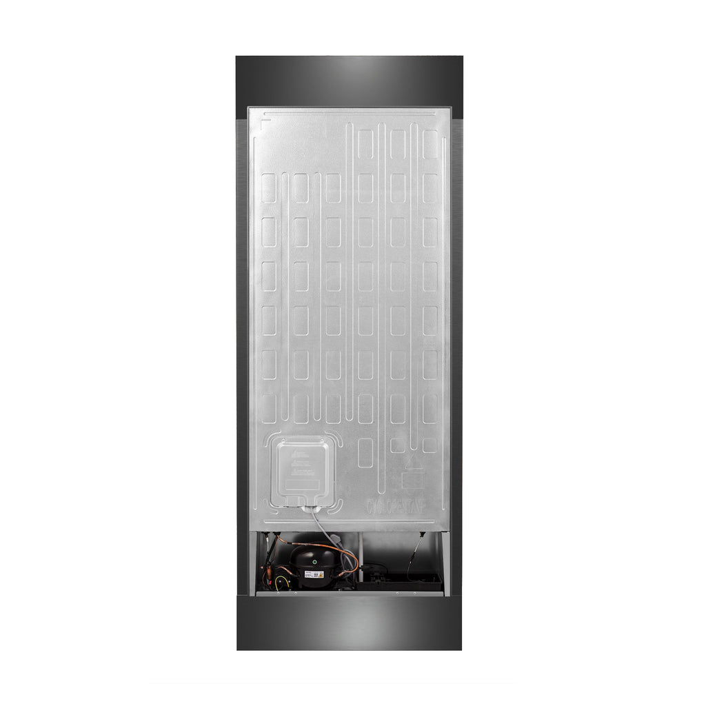 - Featuring a modern stainless-steel back panel, this Refrigerator/Freezer offers organizational options with a total of 4 shelves, 4 door bins and 3 storage drawers that can easily be easily removed for your everyday usage.