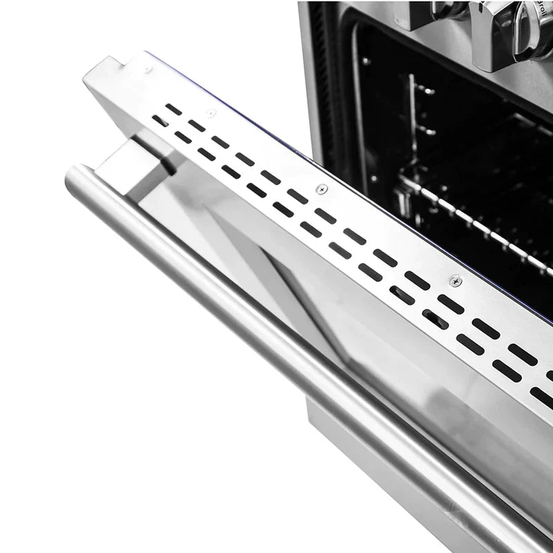 The heavy-duty continuous cast iron grates allow for even heat distribution and maximum stability of cookware mobility over a recessed enamel cooktop cavity which keeps spills and splashes contained and easy to clean. Double gas ovens have a combined 6.58 cu.ft. capacity with a total broil and bake output of 44,000 BTU, encased in blue enamel interiors with insulated oven door and tempered 3-layer glass oven door windows. Right oven convection fan, thermostat and regulator ensures to achieve fast, precision and consistent oven cooking. Included are 4 telescopic oven racks, concave Wok Ring, reversible grill/griddle, Air Fryer basket, rack & drip pan, LP conversion kit and 3-prong power cord. Housed in a high-grade stainless steel body and zinc coated metal knobs with bezels.