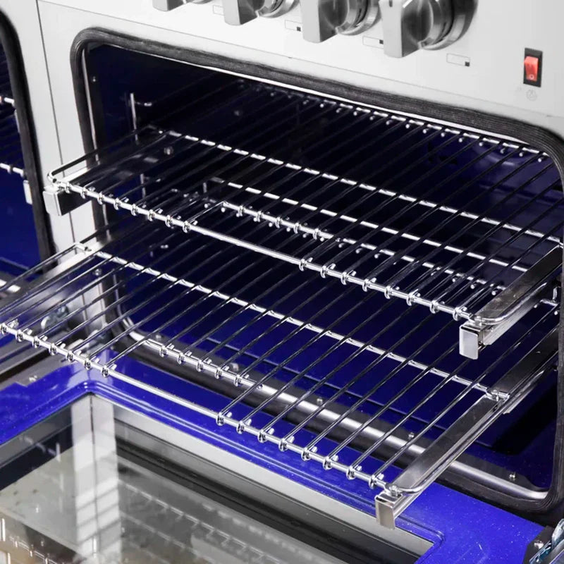 The heavy-duty continuous cast iron grates allow for even heat distribution and maximum stability of cookware mobility over a recessed enamel cooktop cavity which keeps spills and splashes contained and easy to clean. Double electric ovens have a combined 8.64 cu.ft. capacity with a total broil and bake output of 12,600 Watts, encased in blue enamel interiors and sealed with insulated oven doors and tempered 3-layer glass windows. True convection ovens ensure to achieve fast, precision and consistent oven cooking. Included are 2 telescopic oven racks, concave Wok Ring, 2 reversible grill/griddle, Air Fryer basket, rack & drip pan, LP conversion kit and 4-prong power cord. Housed in a high-grade stainless steel body and zinc coated metal knobs with bezels.