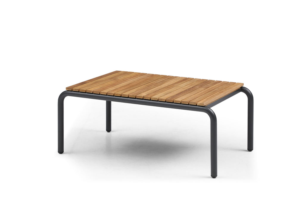 Andrea Outdoor Collection, 4 pieces: Love Seat, Two Single Chairs and Coffee Table. Blue Fabric, Frame and Base in Matt Dark Grey Aluminum, Tabletop in Teak Wood.