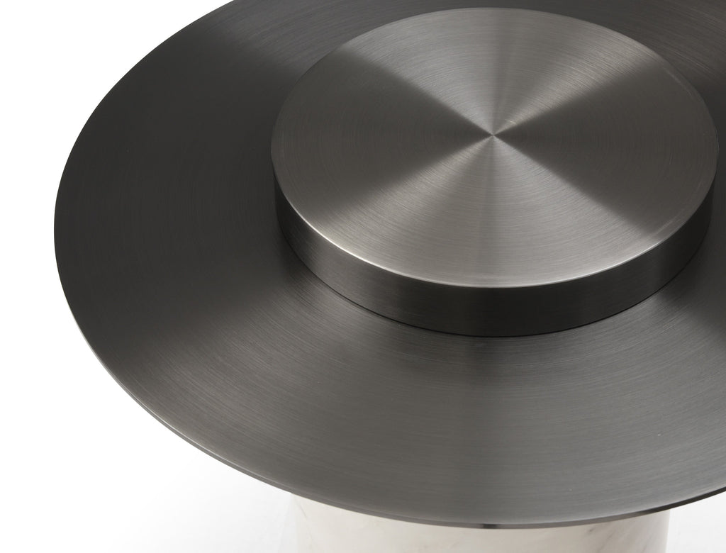 Aviana Round Side Table, Top in Gun Color Stainless Steel, Base in Marble Texture Lacquer.