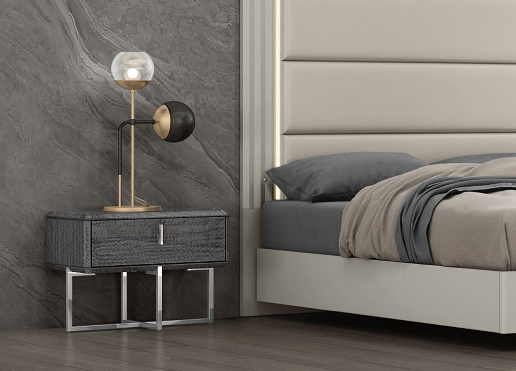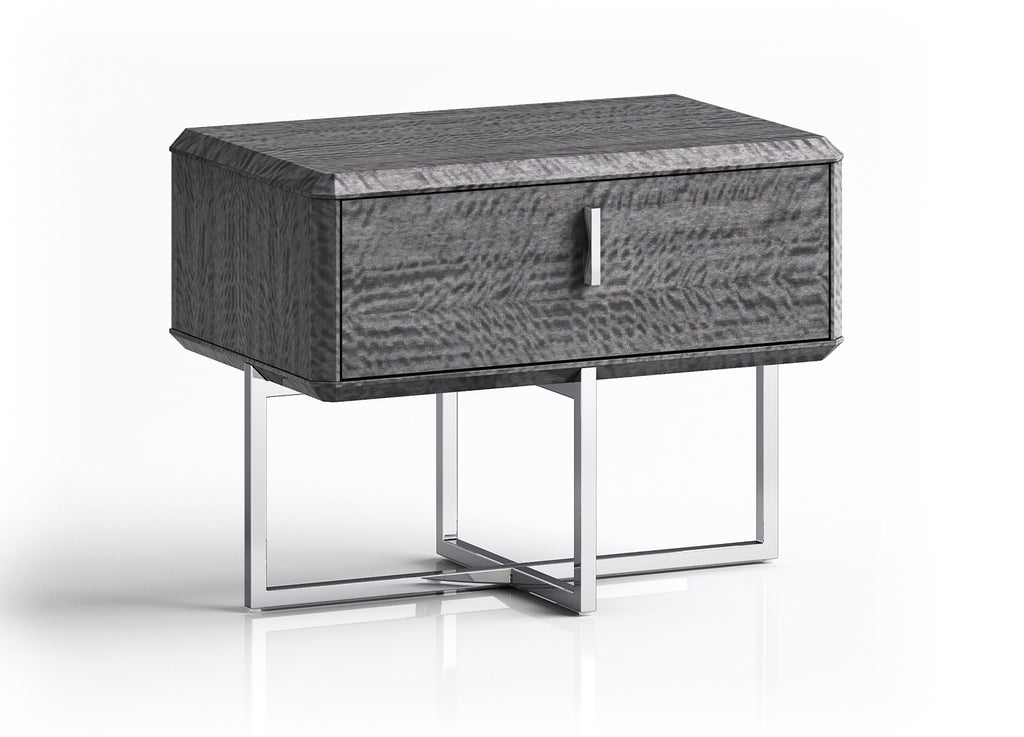 The Chloe nightstand is graced with elegant metal legs and topped with a glossy structure. This unexpected combination of materials lends exclusive style and appeal to this companion piece for the Chloe bed.