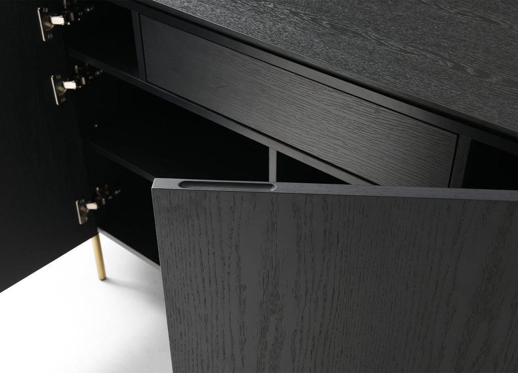 Heidi Buffet, Black Oak Veneer, with Ribbed Sides Design, Inner Drawer and Shelves, Handles and Legs in Brushed Brass.