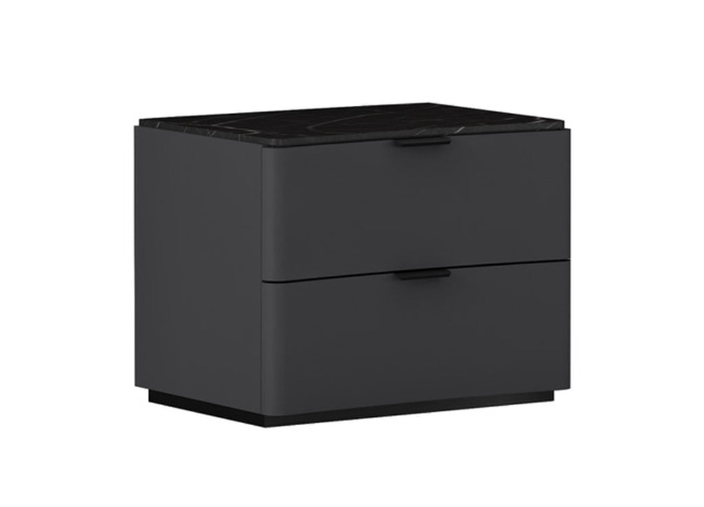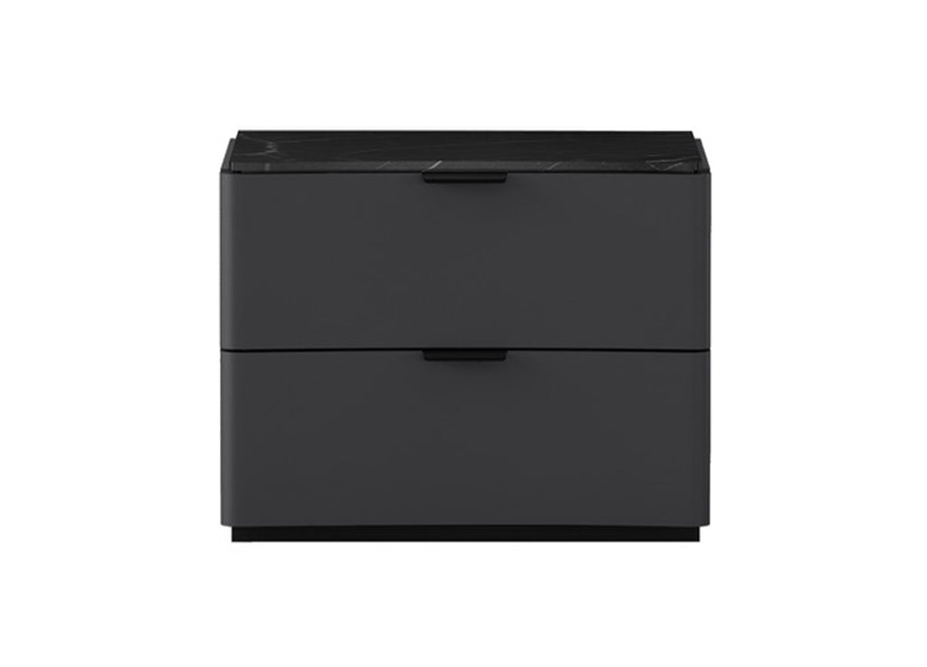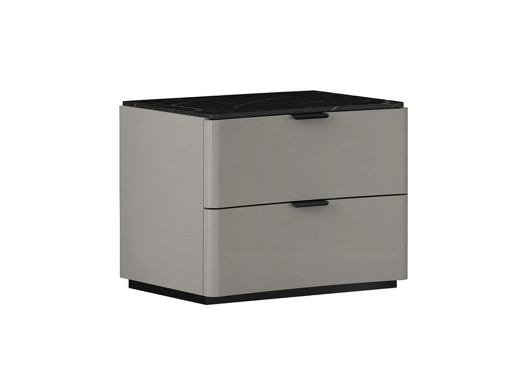 Massimo Nightstand, Available in Matt Dark Grey Lacquer or in High Gloss Light Grey Lacquer, Top in Black and White Marble Texture Lacquer, 2 Self-Closing Drawers and Matt Black Handles.