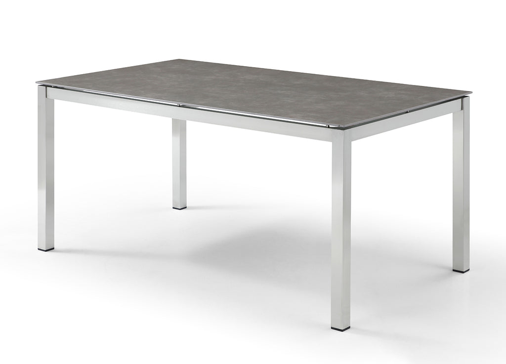 Paola Outdoor Dining Table, 8mm Glass and Ceramic Top, Legs in Brushed Silver Stainless Steel.