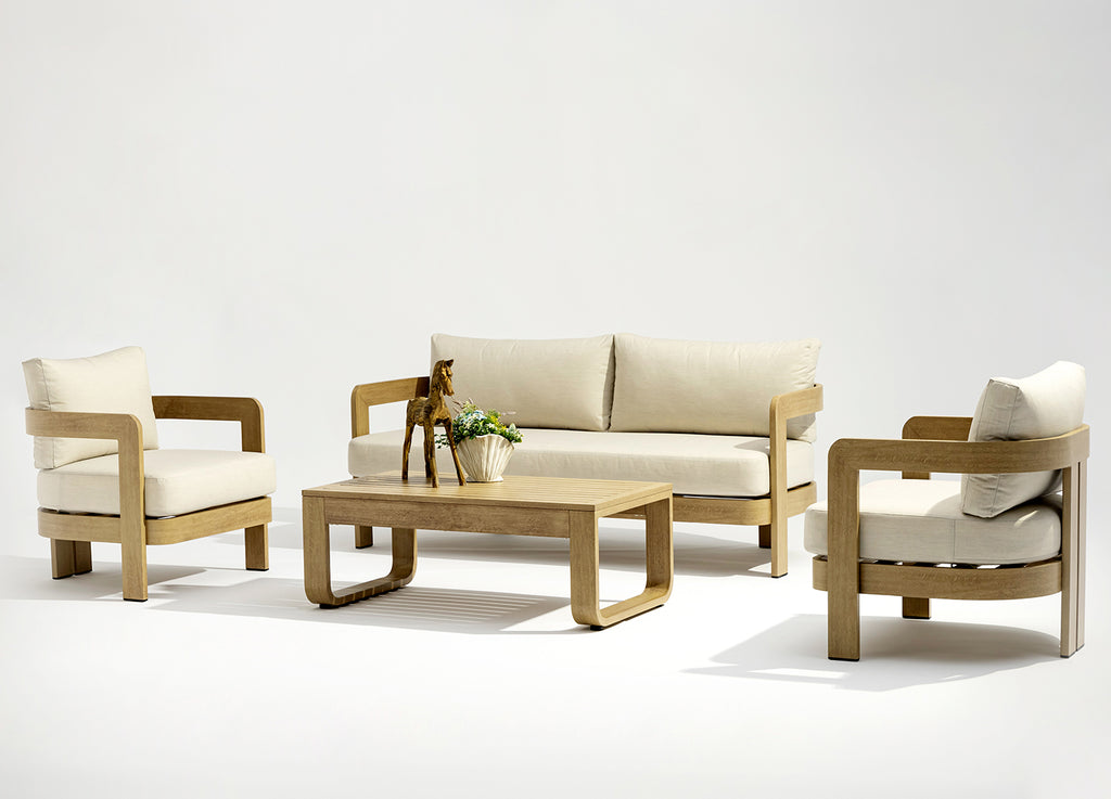 Sally Outdoor Collection, 4 Pieces: One Love Seat, Two Single Chairs and Coffee Table. Structure and Base in Aluminum with Wood Finish. Seat and Back Cushions in Beige Fabric.