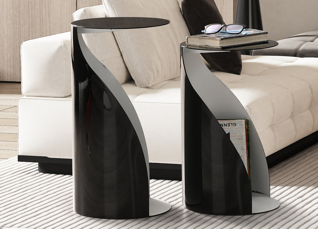 Willie Large or Small Round Side Table, in Full Gold Powder-Coated Steel or Black Powder-Coated Steel on the Outside and White on the Inside.