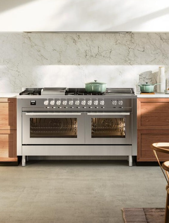 The new Professional Plus range cookers are inspired bring robustness, ergonomics and operability to the domestic space. The ILVE Professional Plus 60 inch range is available in 5 selected colors or in RAL Classic shades on request, combined with a brushed finish for knobs and handles.