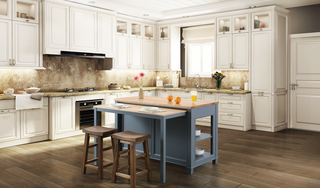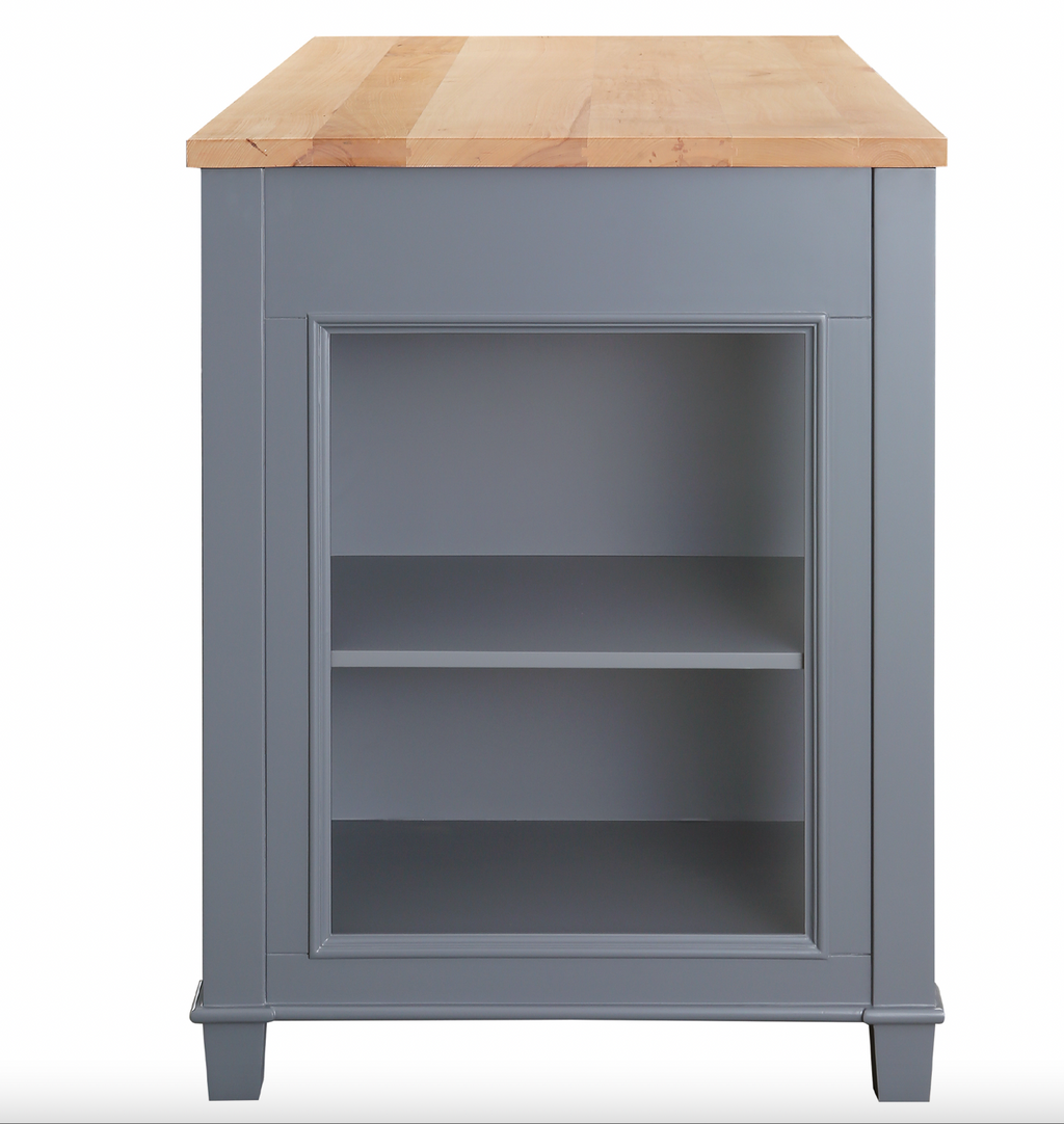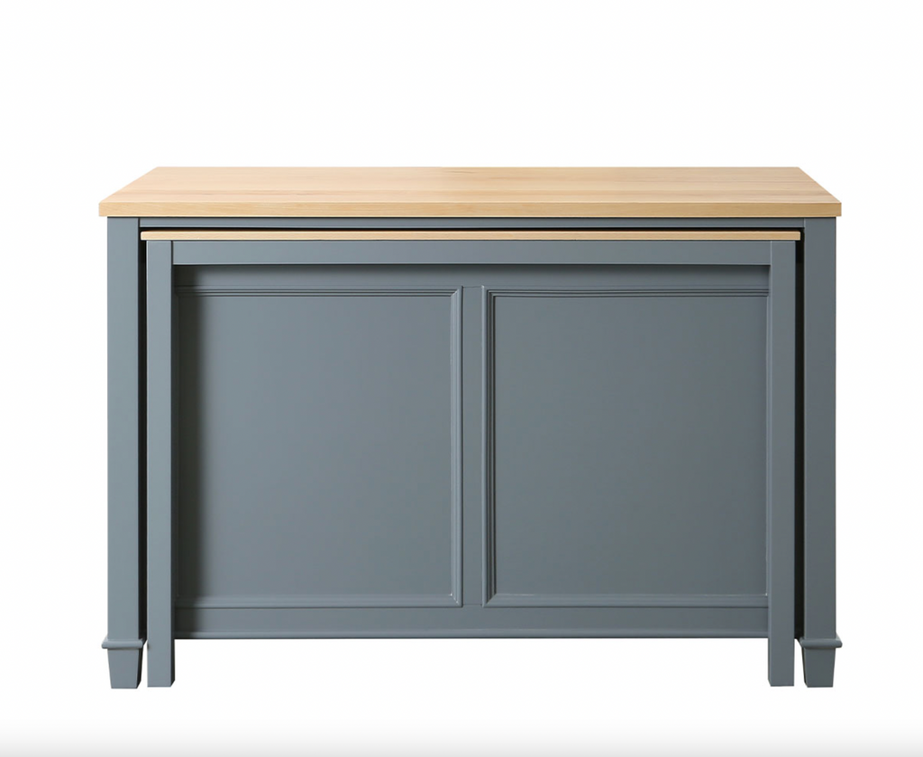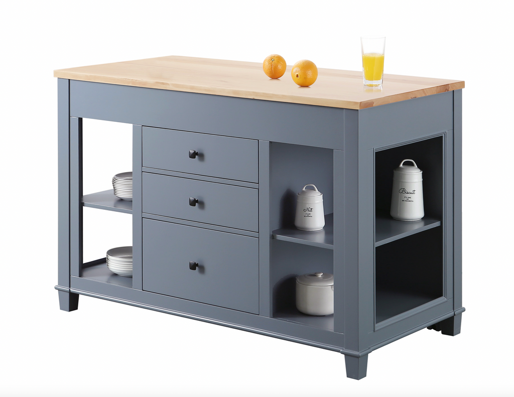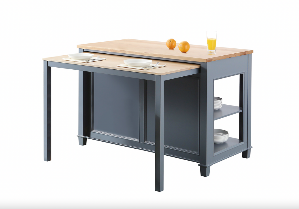 The 54" x 28" footprint of this island is perfect for small to medium sized kitchens. A table measuring 48" wide can slide out and be used for additional counter space and dining when needed. Simply slide the table back in when not in use to maximize your floor space. 3 soft closing drawers, ample shelf space, and natural finished solid hardwood countertop make this multi-functional island the perfect centerpiece for your kitchen.