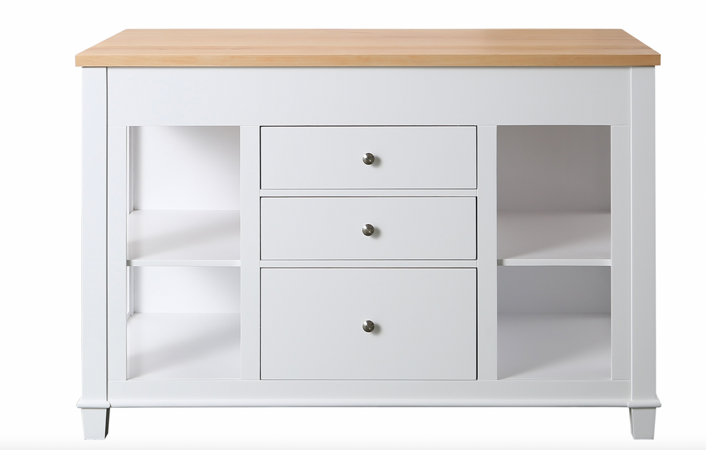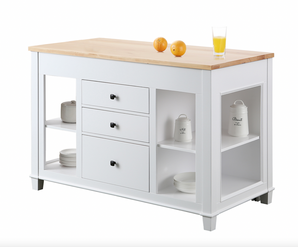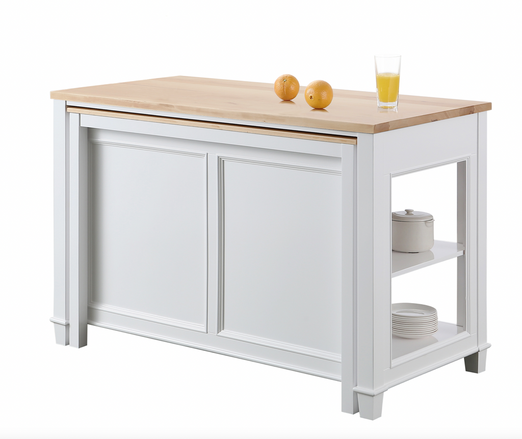 The 54" x 28" footprint of this island is perfect for small to medium sized kitchens. A table measuring 48" wide can slide out and be used for additional counter space and dining when needed. Simply slide the table back in when not in use to maximize your floor space. 3 soft closing drawers, ample shelf space, and natural finished solid hardwood countertop make this multi-functional island the perfect centerpiece for your kitchen.