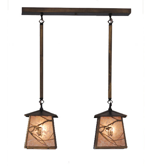 Pine Cones and branches are depicted on the lantern shades of this two light lantern pendant handcrafted in the USA by Meyda artisans. The nature inspired fixture is finished in Antique Copper and has Silver mica panels.