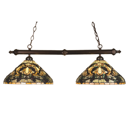 Radiant Concord Purple jewels, Vineyard Green leaves and glistening dew kissed Bark Brown vines wrap around a Golden Sunshine banded stained glass shade. Bring sunny vineyards to your own home with this lovely Meyda Tiffany original two light island. The coordinating hardware is finished in a warm Mahogany Bronze.