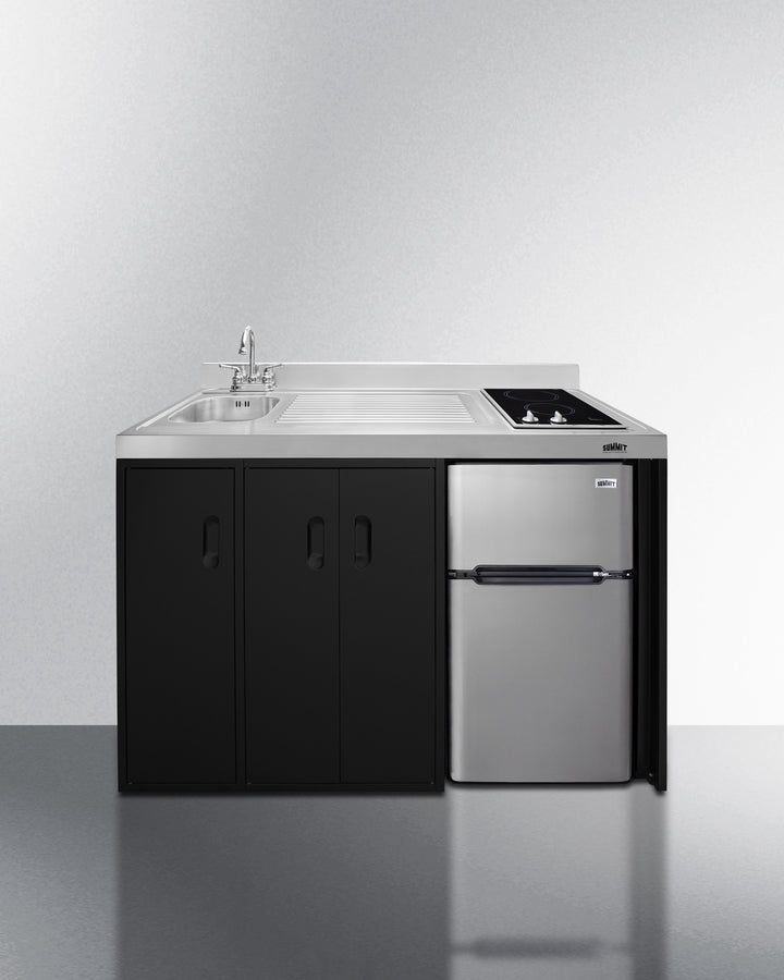 The CK54SINKL is 54" wide with an easy-fitting 24" depth. Its black exterior brings a modern look to efficiency spaces, with added touches of stainless steel on the kitchenette work surface and refrigerator doors. This unit includes a built-in 115V smooth-top cooktop with a rear 7" 900W and a front 5½" 500W heating element. The power cord comes pre-installed for easy setup.