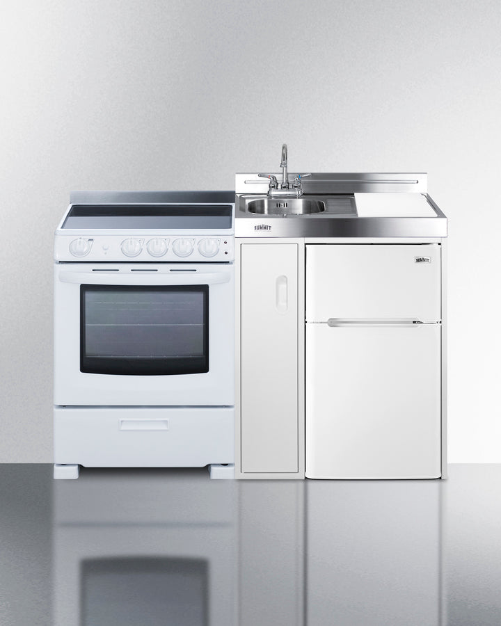 Summit's line of all-in-one combination kitchenettes brings complete kitchen convenience in a slim-fitting design. These units come fully featured with everything you need for the home food-service experience, including a refrigerator with a freezer compartment, 4-burner smooth top range with oven, sink with faucet, cutlery bin with a removable cutting board cover, and storage cabinet for dry goods.
