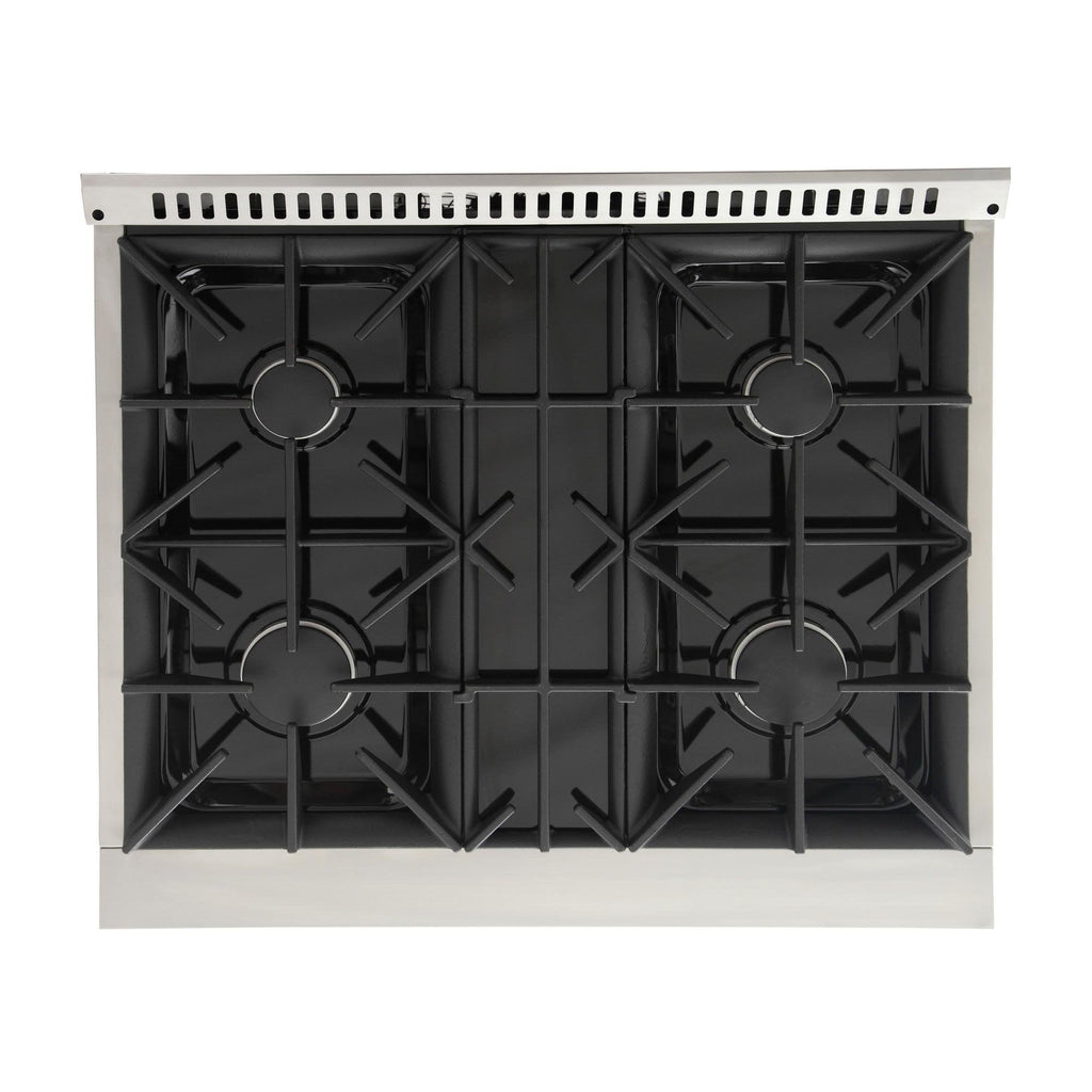 This 30" Freestanding Gas Range by Kucht offers 4 sealed burners and a 4.2 cu. ft. capacity oven. The range features manual convection cooking mode, tube burner broiler, blue porcelain oven interior and black porcelain top.