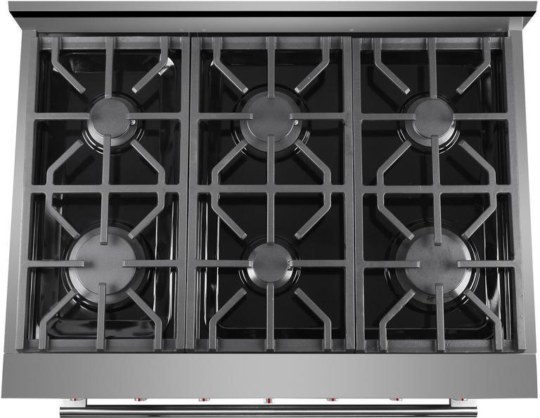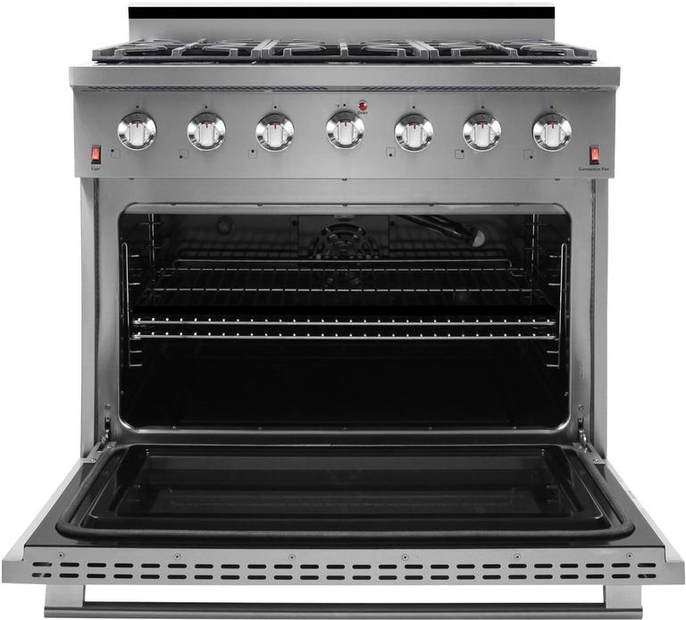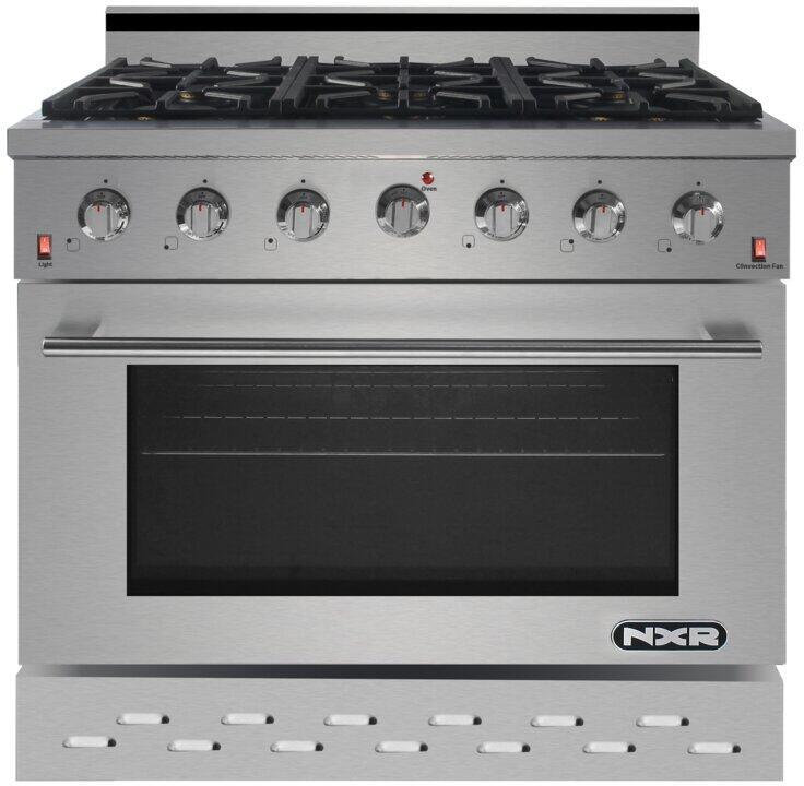 This 36" Freestanding Gas Range from NXR comes with a 6 burner cooktop and a 5.5 cu. ft. oven. The range features convection cooking, black porcelain drip pan and cast iron grates.