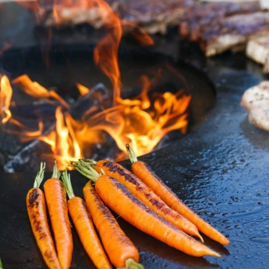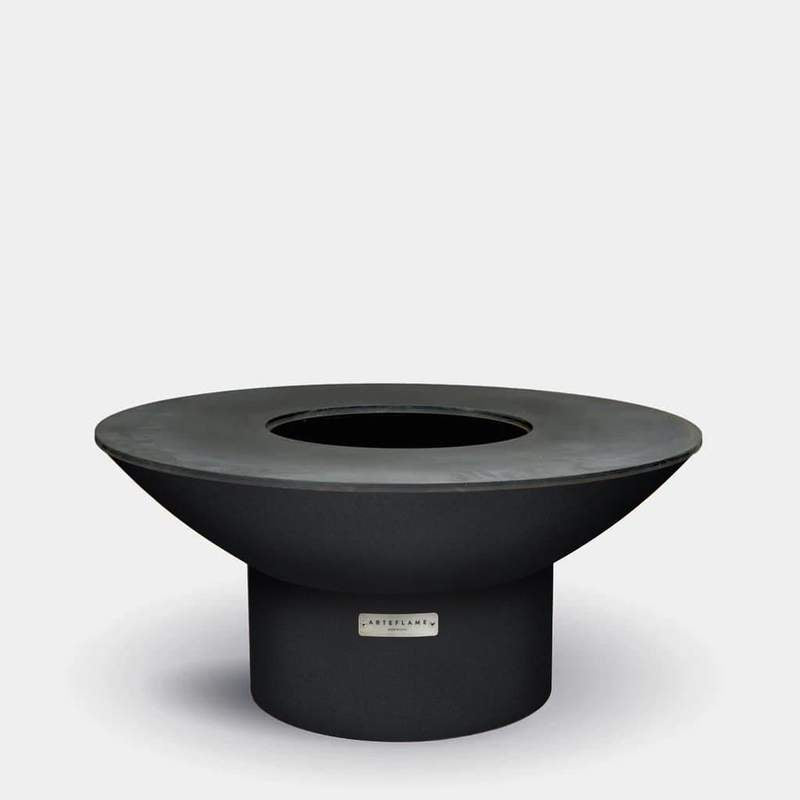 The Arteflame Classic 40" grill with low round base and cooktop elevate the art of outdoor cooking with the sleek, contemporary look and outstanding functionality. Building a wood or charcoal fire in the center of the grill, the cook top heats from the center out. This heat pattern results in higher cooking temperatures closer in as compared to the outer edges so a variety of foods can be cooked at various temperatures all at the same time. When not in use as a grill, the Arteflame can also be enjoyed as a fire bowl with the cooktop on or off, providing warmth and a social serene ambiance.