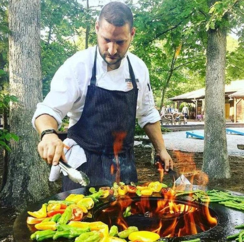 The new One30 is based on the same concept as the Classic Arteflame 40 but in a smaller format.  It stands 30" tall so it can be used standing up or sitting down.  The smaller design is fueled by charcoal or firewood.  Because it is smaller and lighter, it uses less fuel than the 40" versions and heats up faster.  It has a  3/8" thick carbon steel cooktop and a US CORTEN steel base which will last a lifetime.