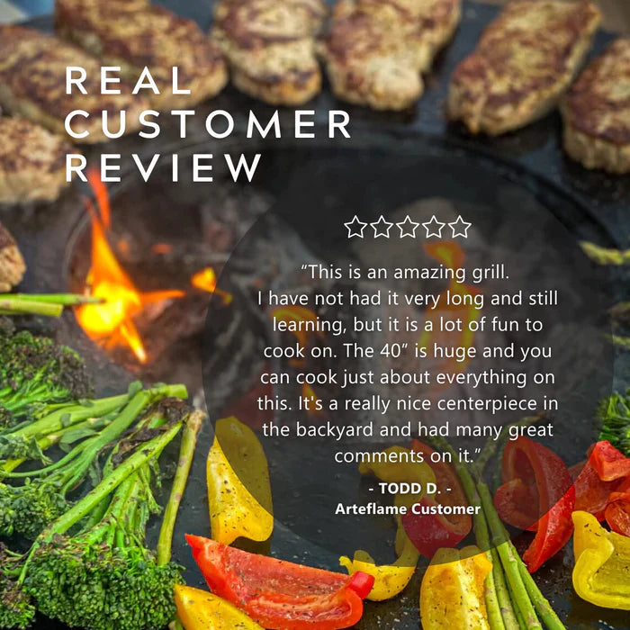 The Arteflame Classic 40" grill is a one of a kind grilling experience. The cooktop is made of 1/2" carbon steel and the spun bowl is a high grade of US CORTEN steel or "weathering" steel.