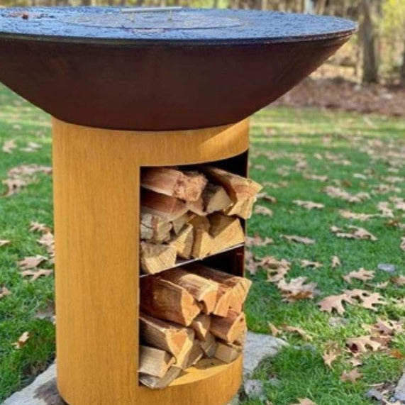 The Arteflame Classic 40" grill with tall round base is also available with storage.  It has the same sleek look with outstanding functionality.  Building a wood or charcoal fire in the center of the grill, the cook top heats from the center out. This heat pattern results in higher cooking temperatures closer in as compared to the outer edges so a variety of foods can be cooked at various temperatures all at the same time. When not in use as a grill, Arteflame can also be enjoyed as a fire bowl with the cooktop on or off, providing warmth and a social and serene ambiance.
