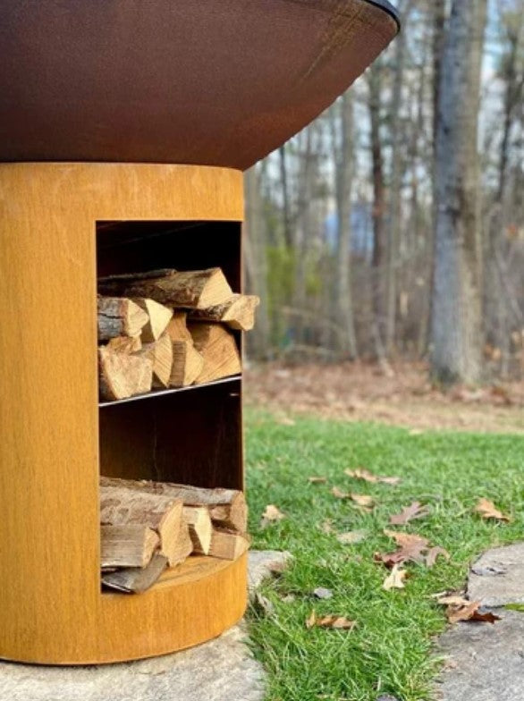 If you are looking for some storage space underneath your Arteflame, you want the Tall Round base With Storage.  Perfect for storing your utensils, charcoal or firewood.  The stainless steel shelve is removable in case you want to just store firewood.  The stainless shelve divides the storage space into two 10" compartments (18 1/2" deep by 20" wide).  The internal draining system ensures al rain water drains away from the storage compartment.