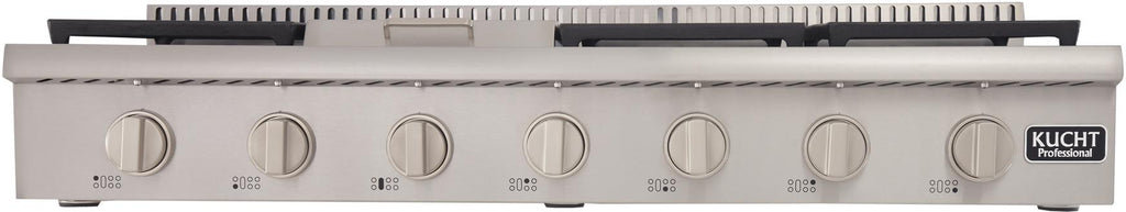 This 48" Professional Series gas rangetop from Kucht offers 6 sealed burners ranging from 18000 BTU to 12000 BTU output and a 18500 BTU griddle. This rangetop also features electronic ignition with auto re-ignition, black porcelain top, heavy duty cast-iron grates and high quality control knobs.