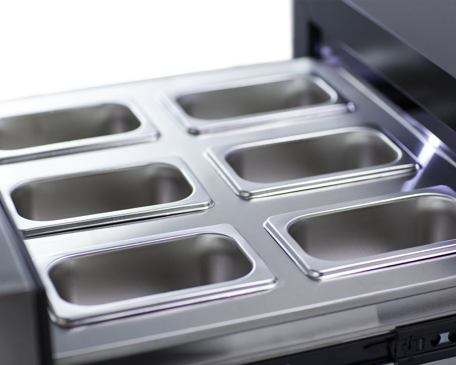 The upper drawer compartment offers over 1 cu.ft. of refrigerated storage with a durable stainless steel exterior and interior. We include a removable stainless steel tray insert with 6 commercial steam table/hotel pans, ideal for making condiments and other refrigerated bar essentials easily accessible to busy foodservice staff.