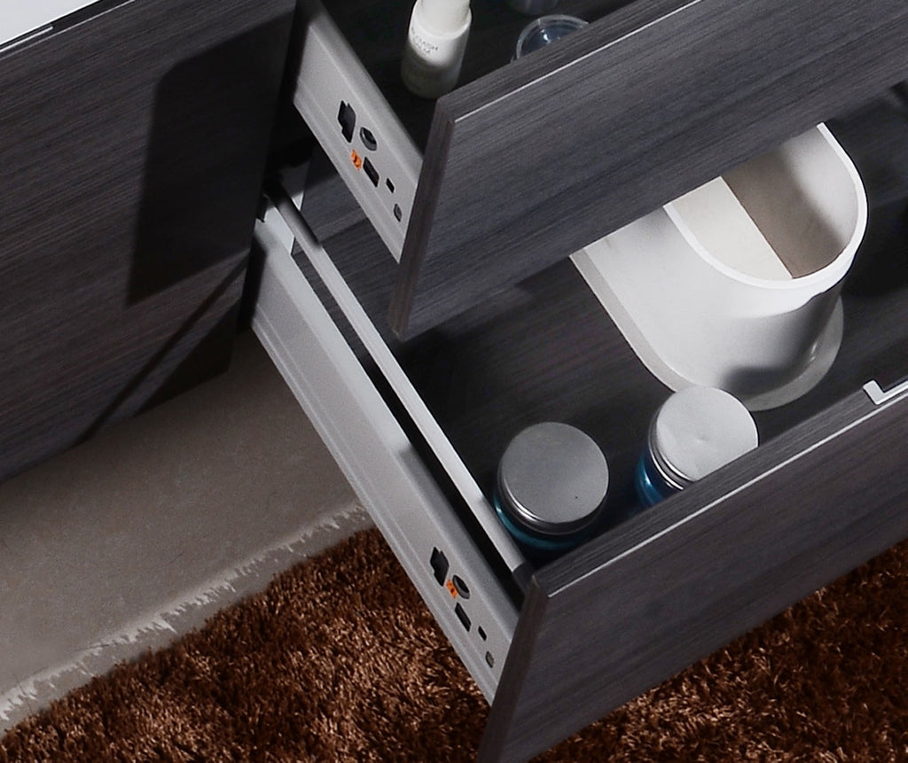 The Bliss is one of the most elegant modern Bathroom Vanities around.  This 60 Inch Single Sink model comes with a reinforced Acrylic sink, Marine Veneer Constructed Console that is fully Moisture and Waterproof, with high-quality European Hardware, that provides smooth soft-closing operation. It features two Doors and two fully functional drawers.