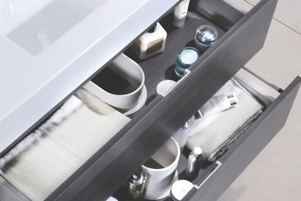 The Bliss is one of the most elegant modern Bathroom Vanities around.  This 80 Inch Single Sink model comes with a reinforced Acrylic sink, Marine Veneer Constructed Console that is fully Moisture and Waterproof, with high-quality European Hardware, that provides smooth soft-closing operation. It features four fully functional drawers.