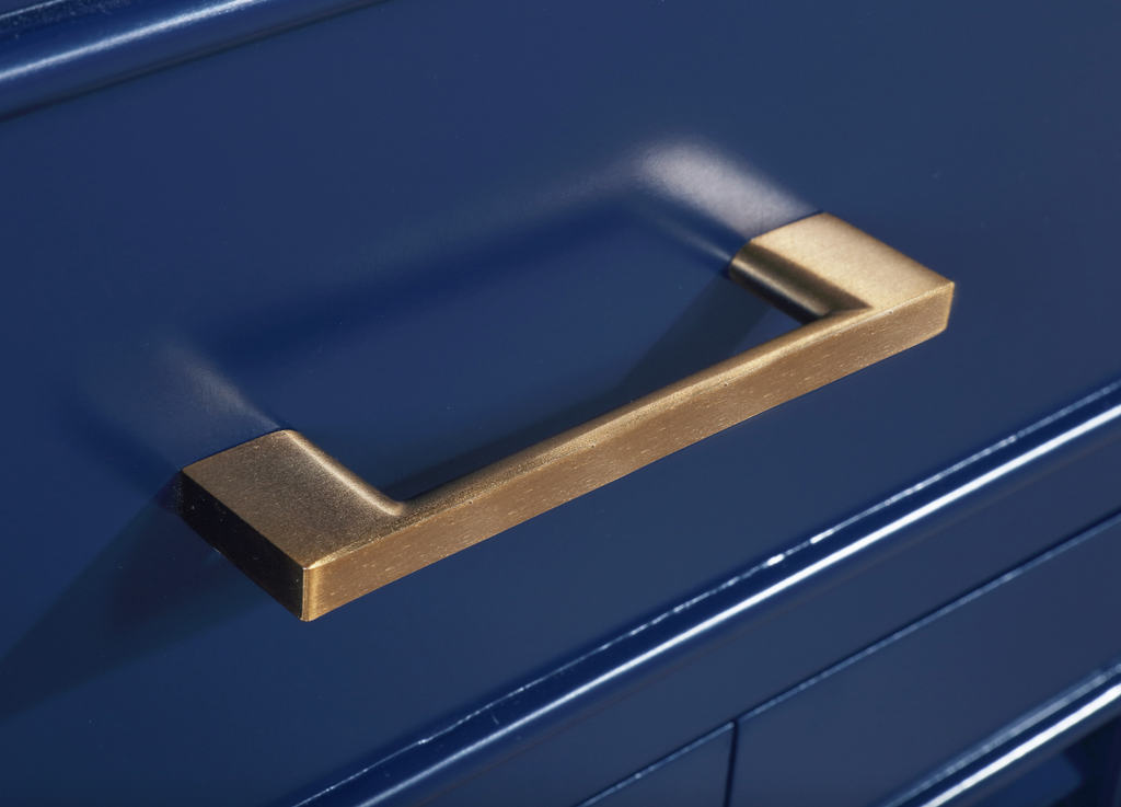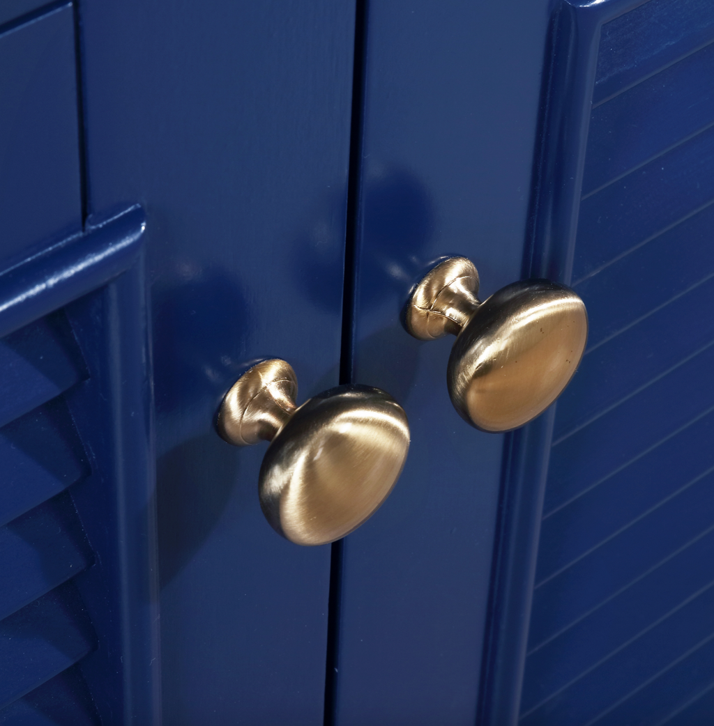 Constructed of solid hardwood, this vanity will maintain its beauty and functionality year after year. The porcelain countertop and integrated sink with overflow perfectly matches the styling of the cabinet, and is extremely simple to maintain. Opening the 2 soft closed doors reveals an ample storage space. The included satin brass hardware provides the perfect finishing touch to the blue cabinet. Faucet and drain are not included.
