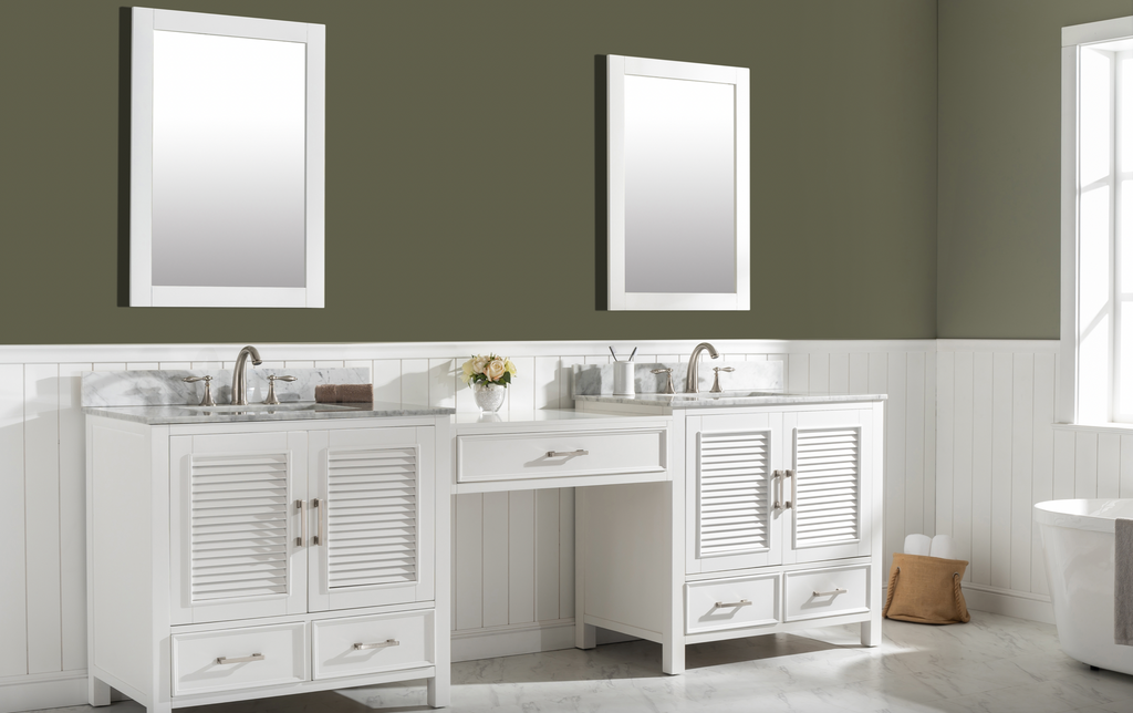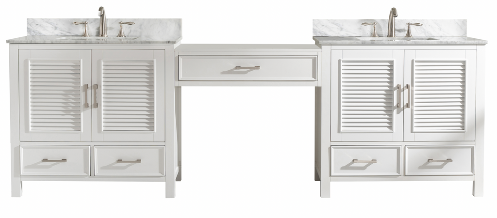 This unique modular vanity set is comprised of 2 single vanities connected by a floating make up table that is both aesthetically beautiful and functional. All Estate vanity cabinets are constructed from solid birch hardwood and paired with a 1 inch thick seamless quartz countertop and backsplash. Soft closing doors and drawers provide smooth and quiet operations, while brushed finished metal hardware provides the perfect finishing touch. Other fine details include white porcelain sinks with overflow, dovetail joint drawer construction, predrilled holes to accommodate 8-inch widespread faucets, and multi-layer paint finish on the cabinets provide beauty and durability for years to come. Mirrors, faucets, and drains are not included.