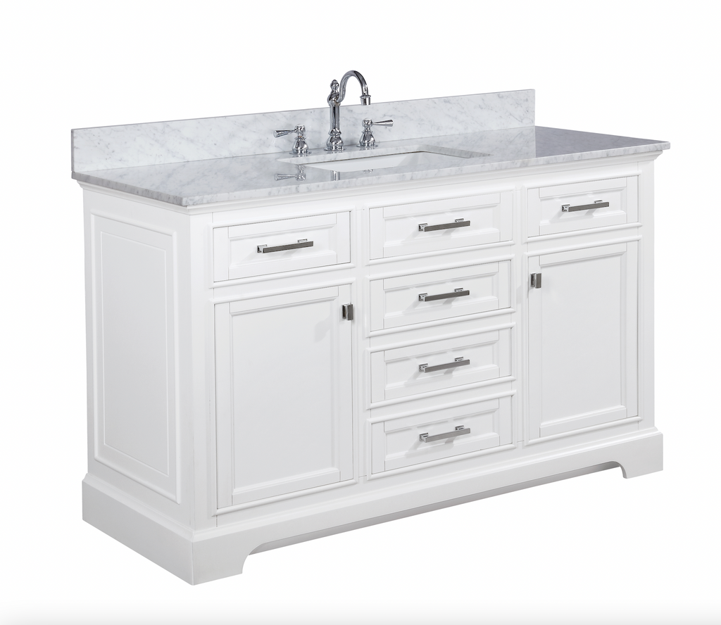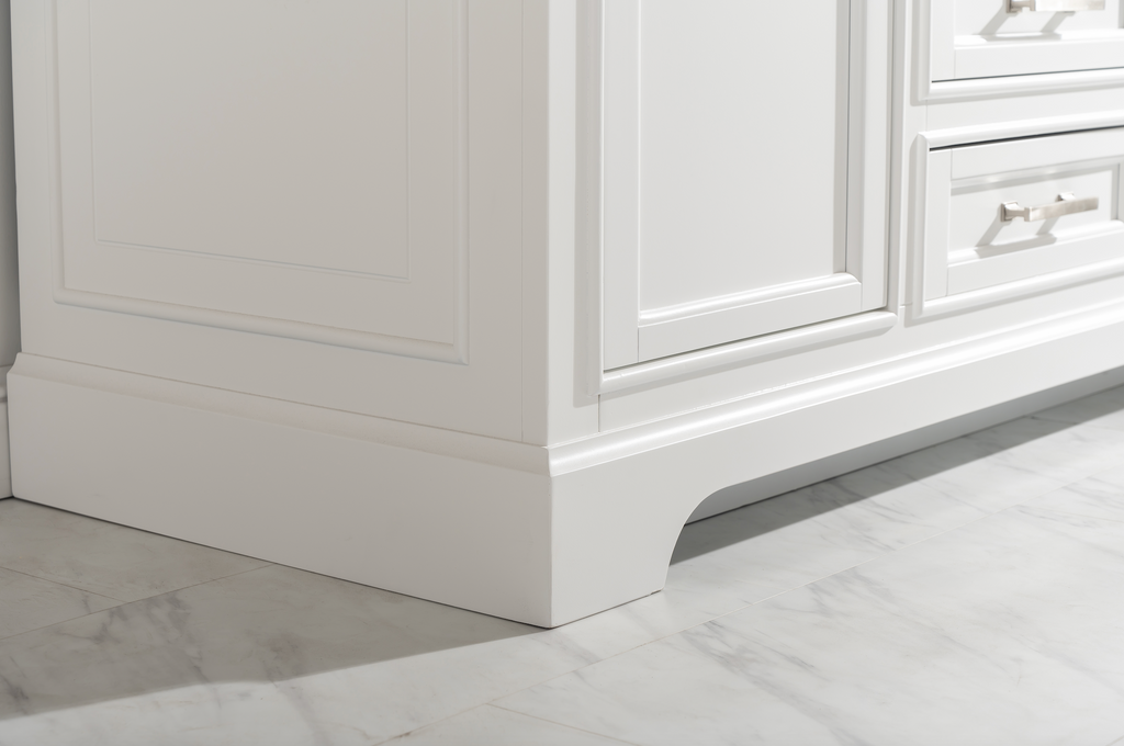 Soft-closing doors and drawers provide smooth and quiet operations, with brushed metal hardware providing the perfect finishing touch. Other fine details include a white porcelain sink with overflow, dovetail joint drawer construction, pre-drilled holes to accommodate 8-inch widespread faucets, and a multi-layer paint finish on the cabinet, to provide beauty and durability for years to come.