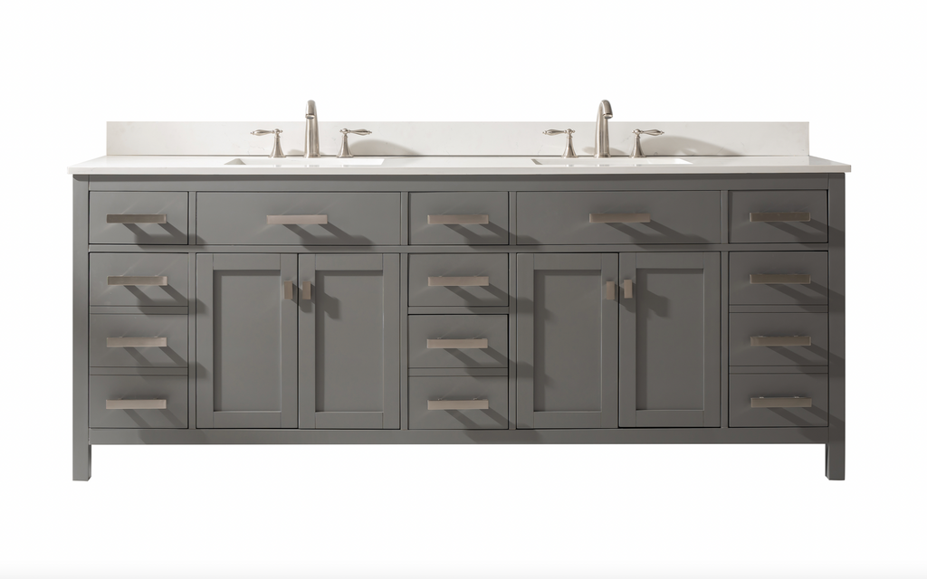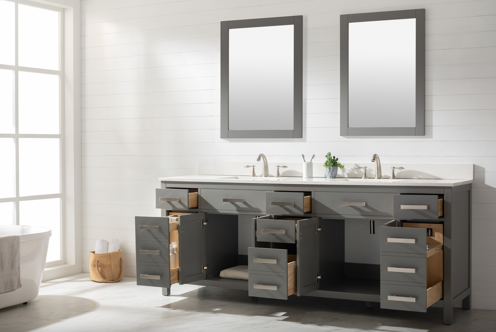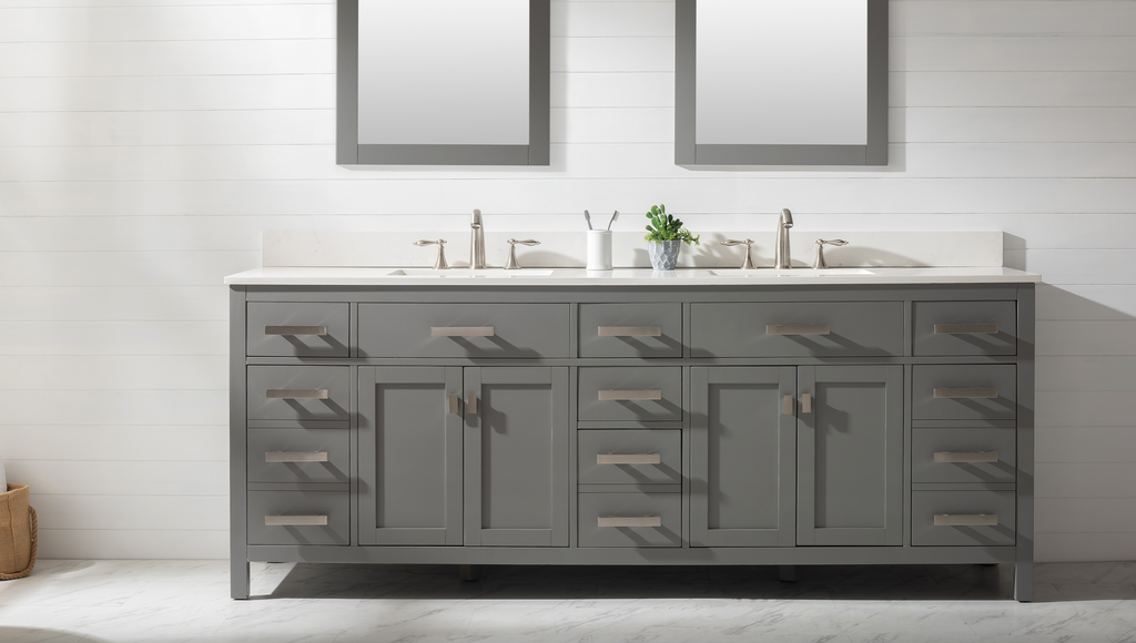 All Valentino vanity cabinets are constructed from high-grade solid birch hardwood, plywood, and MDF, engineered to prevent warping. Paired with an 1-inch thick seamless quartz countertop and backsplash. Soft-closing doors and drawers provide smooth and quiet operations, with brushed metal hardware providing the perfect finishing touch. Other fine details include a white porcelain sink with overflow, dovetail joint drawer construction, pre-drilled holes to accommodate 8-inch widespread faucets, and a multi-layer paint finish on the cabinet, to provide beauty and durability for years to come.