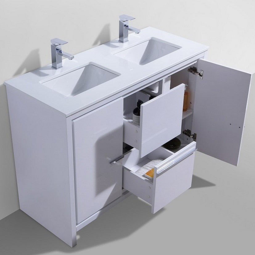 KubeBath Dolce 48″ Double Sink High Gloss White Modern Bathroom Vanity with White Quartz Counter-Top AD648DGW