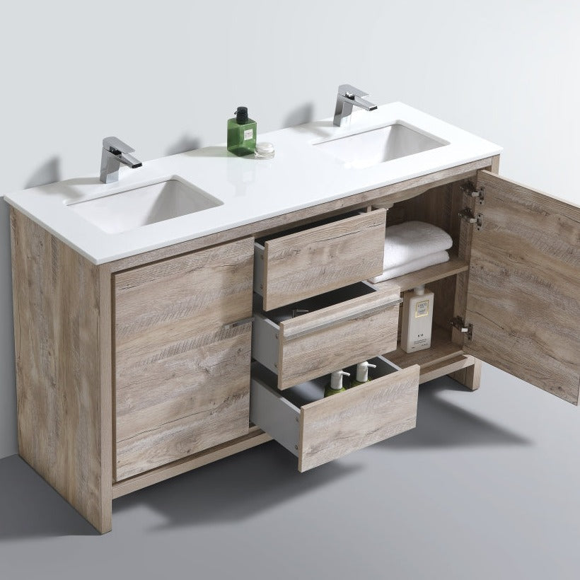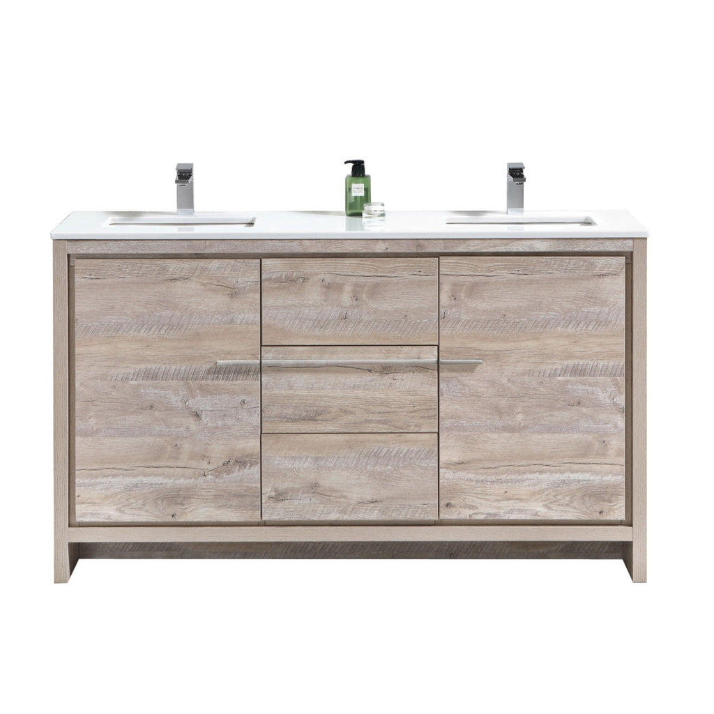 KubeBath Dolce 60″ Double Sink Nature Wood Modern Bathroom Vanity with White Quartz Counter-Top AD660DNW