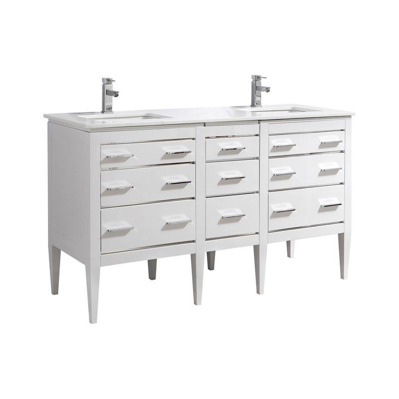 Inspired by both the art deco movement of the '20s, '30s, and '40s and the elegant simplicity of European design, the Eiffel Bathroom Vanity was created from responsibly sourced Solid Wood. Each piece is assembled using intricate shapes that slot together forming a sturdy yet graceful structure. The Eiffel 60″ Vanity features seven fully functional drawers, a pure white Quartz countertop with a white Ceramic undermount Sink. The cabinet is finished in a white lacquer paint finish, while the inside of the drawers are varnished, with the natural wood color exposed.