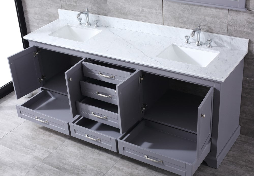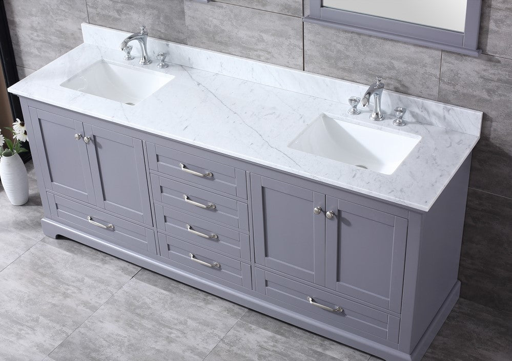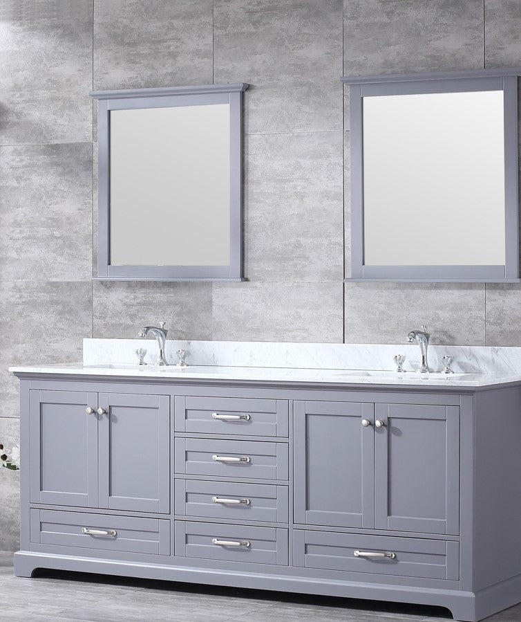Lexora Dukes 80" Dark Grey Double Vanity, White Carrara Marble Top, White Square Sinks and 30" Mirrors LD342280DBDSM30