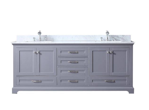 Lexora Dukes 80" Dark Grey Double Vanity, White Carrara Marble Top, White Square Sinks and no Mirror LD342280DBDS000