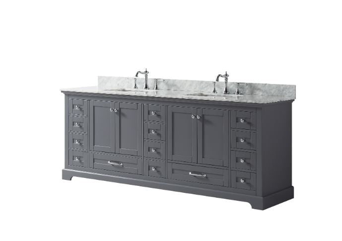 Lexora Dukes 84" Dark Grey Double Vanity, White Carrara Marble Top, White Square Sinks and no Mirror LD342284DBDS000
