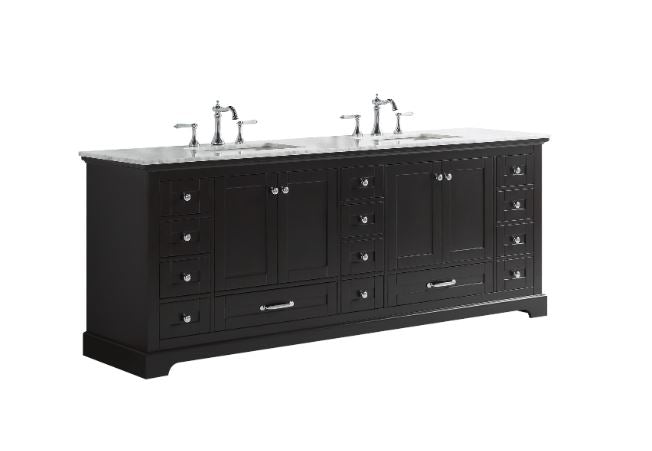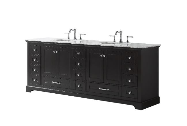 Lexora Dukes 84" Espresso Double Vanity, White Carrara Marble Top, White Square Sinks and no Mirror LD342284DGDS000