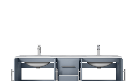 The wall-mounted Geneva vanity in dark grey from Lexora is a beautiful blending of postmodern style and sensible functionality. Its simple, box-like design is complemented by a countertop that lends hints of classical style. When mounted on the wall, the Geneva vanity leaves ample space beneath for additional storage—ideal for bathrooms with limited space.