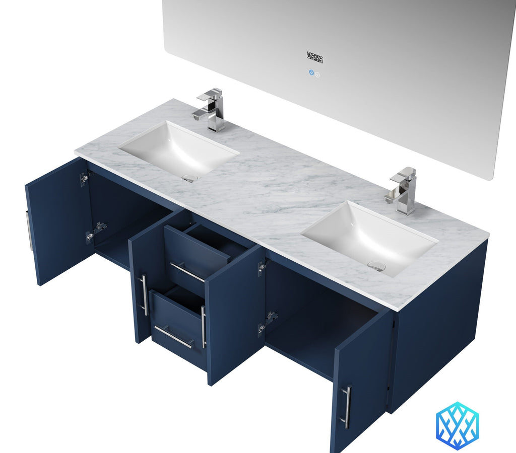 Lexora Geneva 60" Navy Blue Double Vanity, White Carrara Marble Top, White Square Sinks and 60" LED Mirror LG192260DEDSLM60
