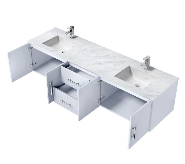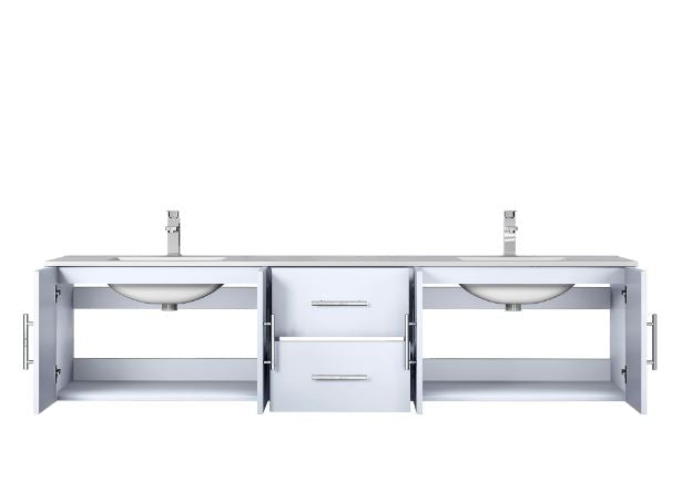 The wall-mounted Geneva vanity in white from Lexora is a beautiful blending of postmodern style and sensible functionality. Its simple, box-like design is complemented by a countertop that lends hints of classical style.