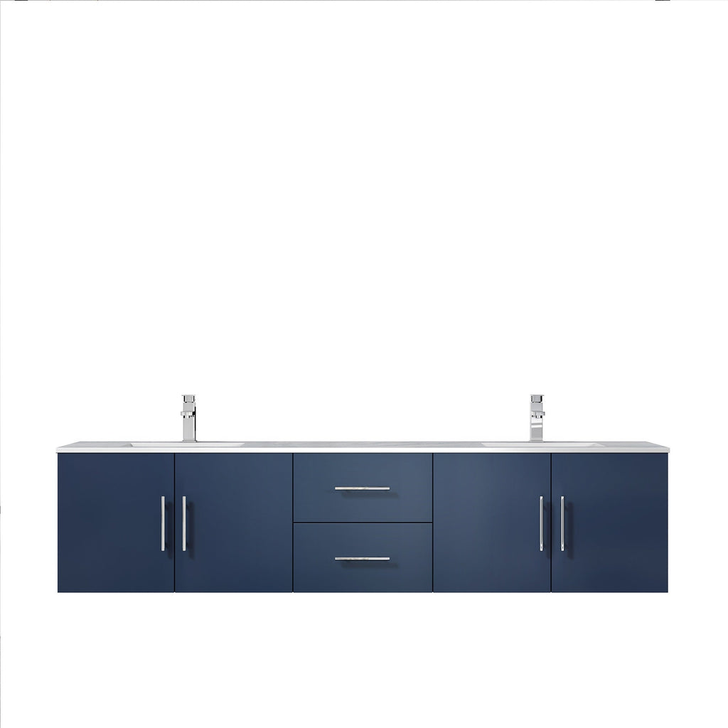 The wall-mounted Geneva vanity in navy blue from Lexora is a beautiful blending of postmodern style and sensible functionality. Its simple, box-like design is complemented by a countertop that lends hints of classical style.