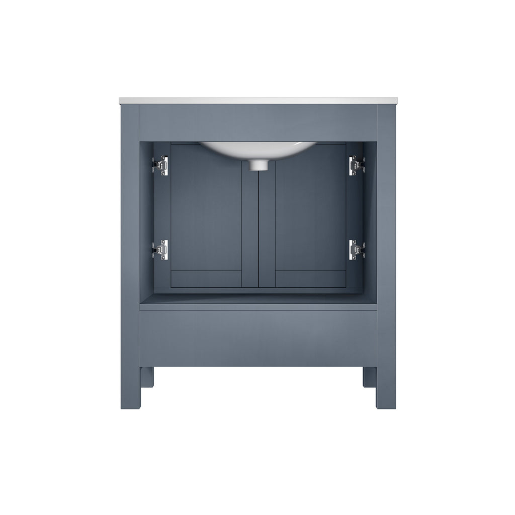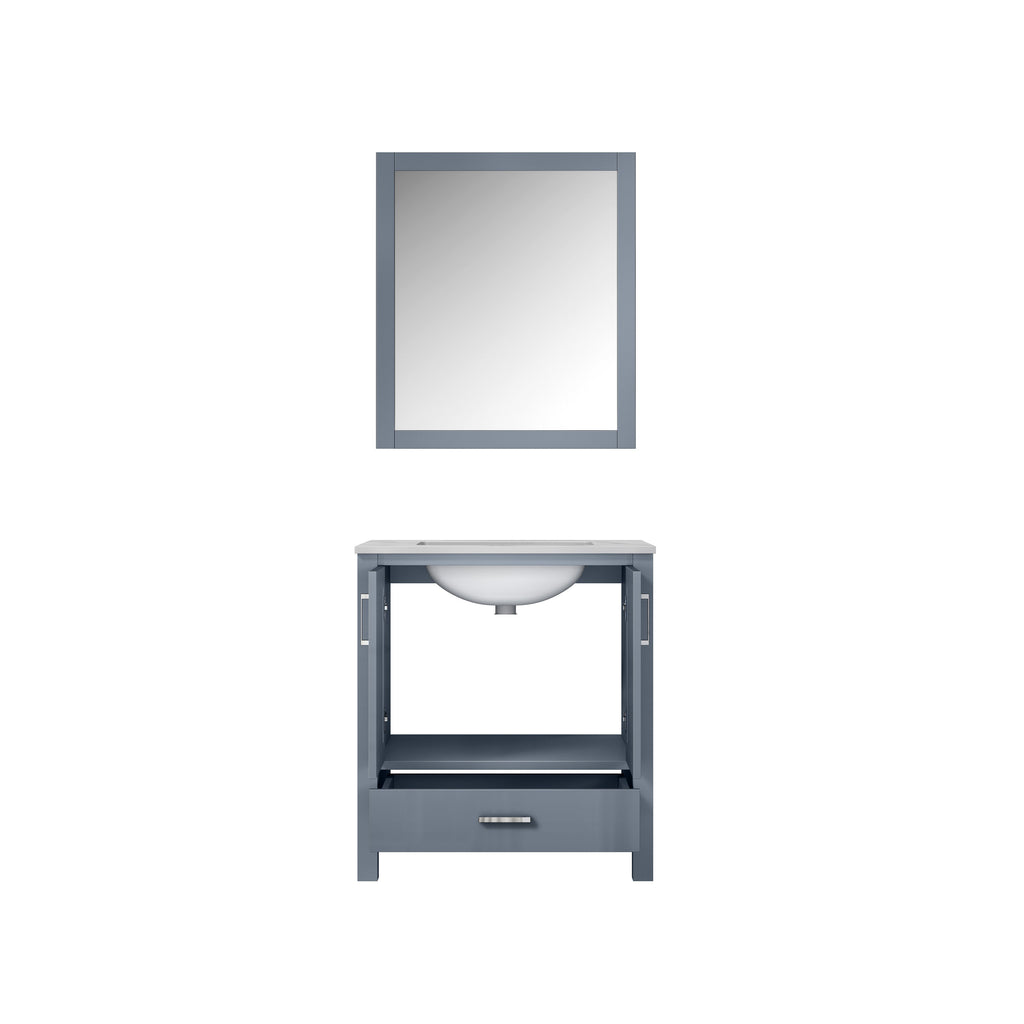 Lexora Jacques 30" Dark Grey Single Vanity, White Carrara Marble Top, White Square Sink and 28" Mirror LJ342230SBDSM28